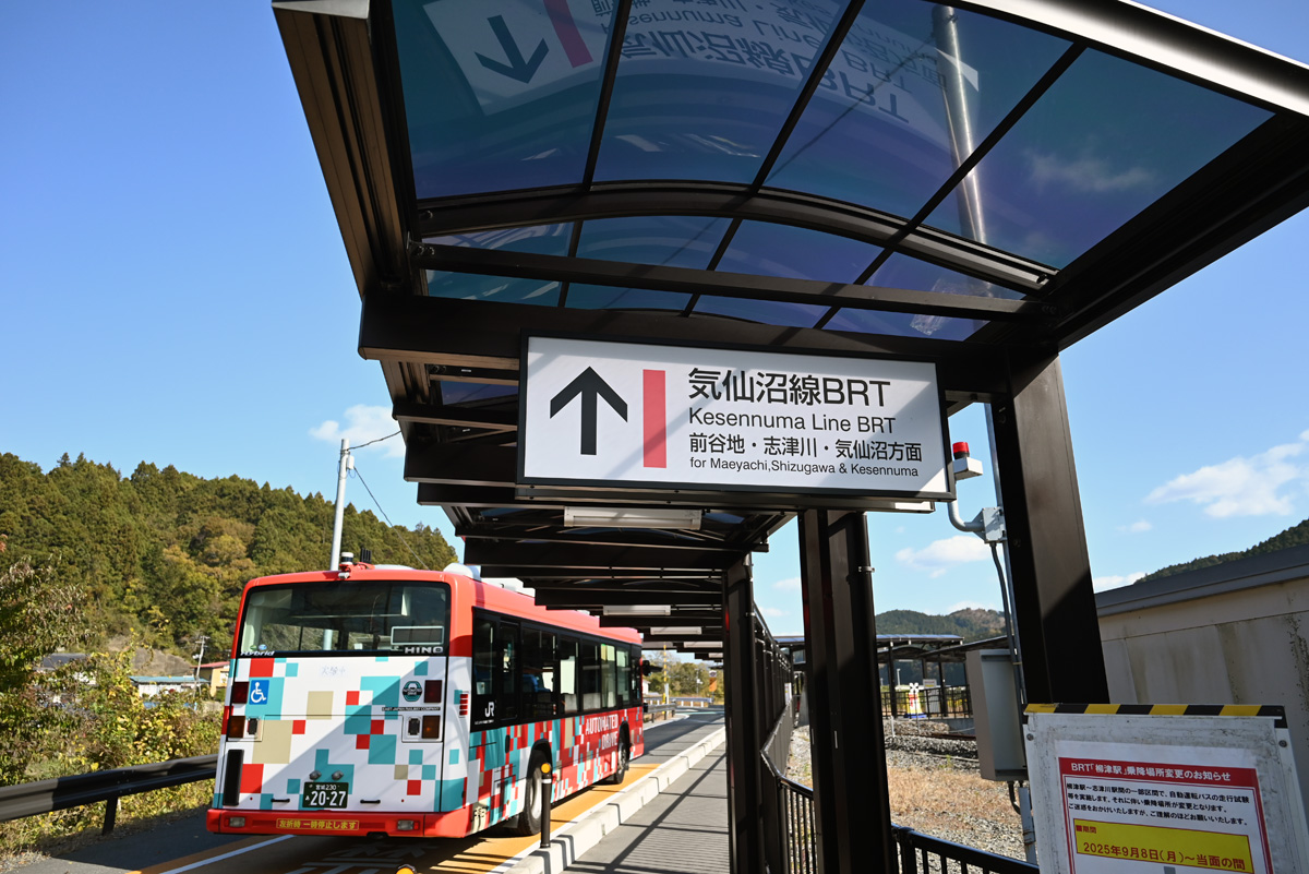 柳津駅から気仙沼線はBRTとなる。もはやレールのない路、しかも現在は自動運転の実験中とかで、「国道を走ります」とアナウンス。おい、それでは完全にバスではないかという私の嘆きをブオーンと掻き消して、バスは国道を走った。二時間近くも。