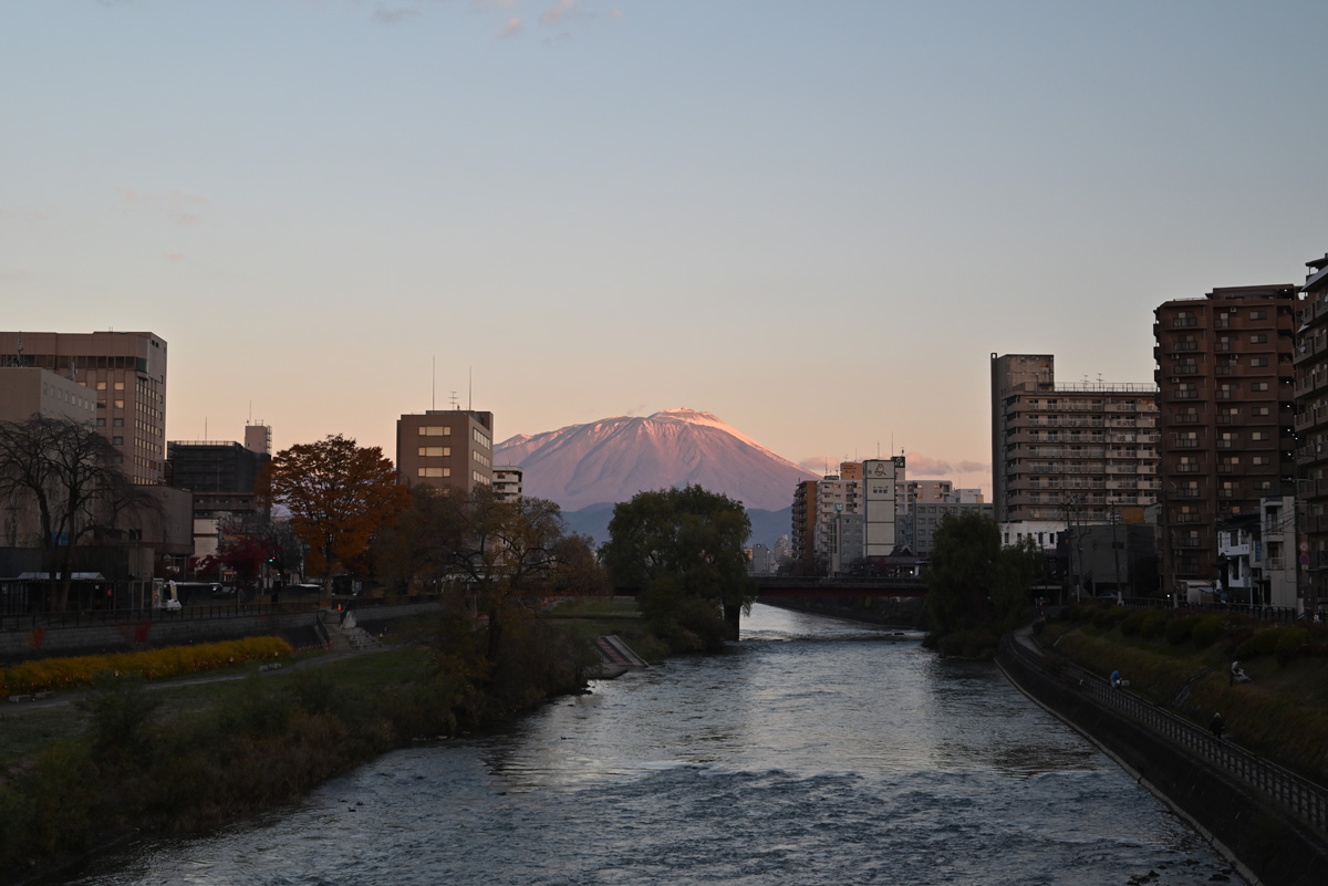 霜が降りていた。始まりを告げるような冷たく澄んだ朝日に、冠雪した岩手山が染まる。北上川は鮭が遡るだけでなく、昨今は熊まで歩いているらしい。花輪線でしばらく岩手山につきまとうと、光りに反射して、秀麗な姫神山の姿が車窓に映り込んだ。姫神山に登ったときは曇天で分からなかったが、なるほどいつも岩手山と向かい合っている。花輪線が裏側まで回り込むと、岩手山は八幡平に繋がっていた。