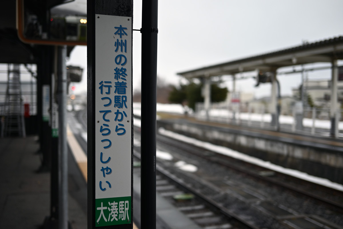 本州最北端の下北駅の、もう一つ奥の駅が終着駅で、十四時二分に大湊着。感慨に浸ることなく十四時十三分、野辺地に向けて折り返した。こんなに哀しい趣味趣向、いや挑戦があってよいものなのか。下北半島まで来て下風呂温泉に行かず、薬研温泉にも、せめてむつ矢立温泉にと、種々天秤に掛けて逡巡するも、次の路線に向けて当地を後にした。